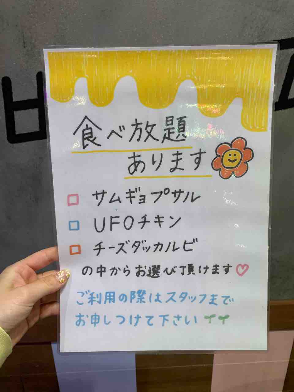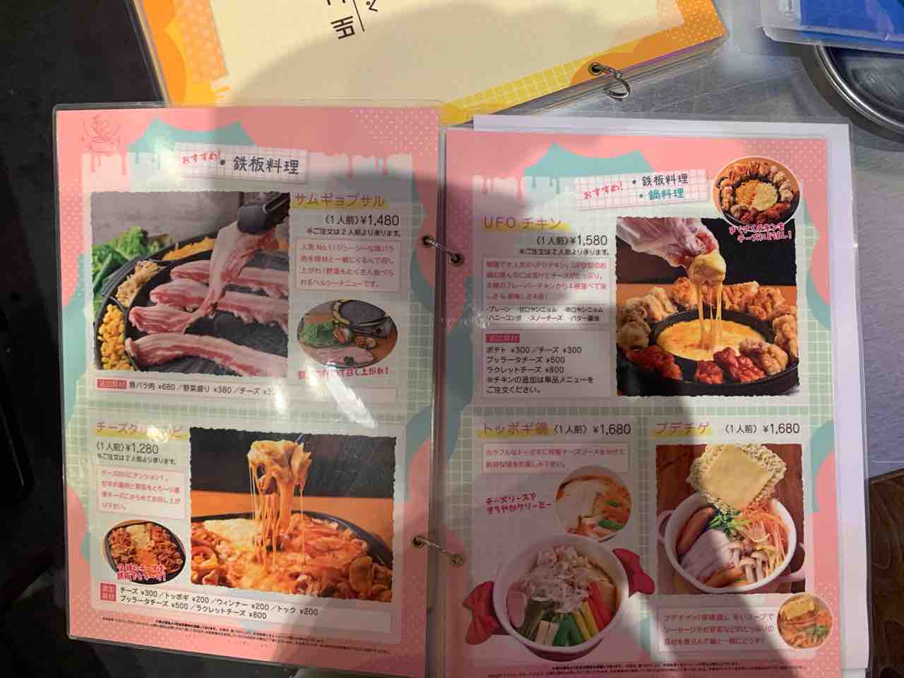 お料理の種類も豊富で、メジャーなサムギョプサルやチーズダッカルビをはじめ、チキンやビビンバなどのご飯ものもありました。食べ放題もできるそうです。