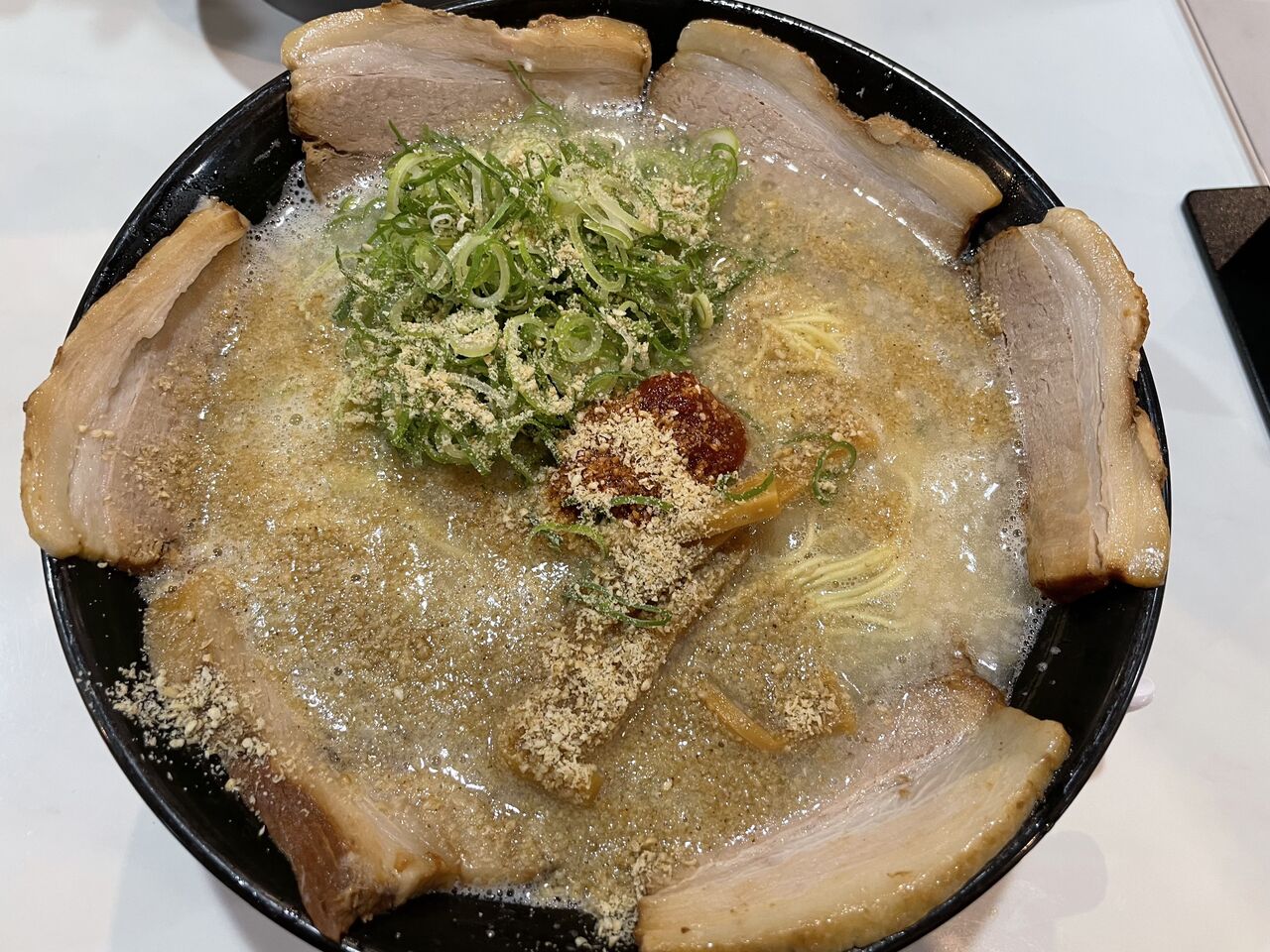 今回オーダーしたのは「豚骨ラーメン チャーシュー麺(1000)」「大盛り(100円)」です。