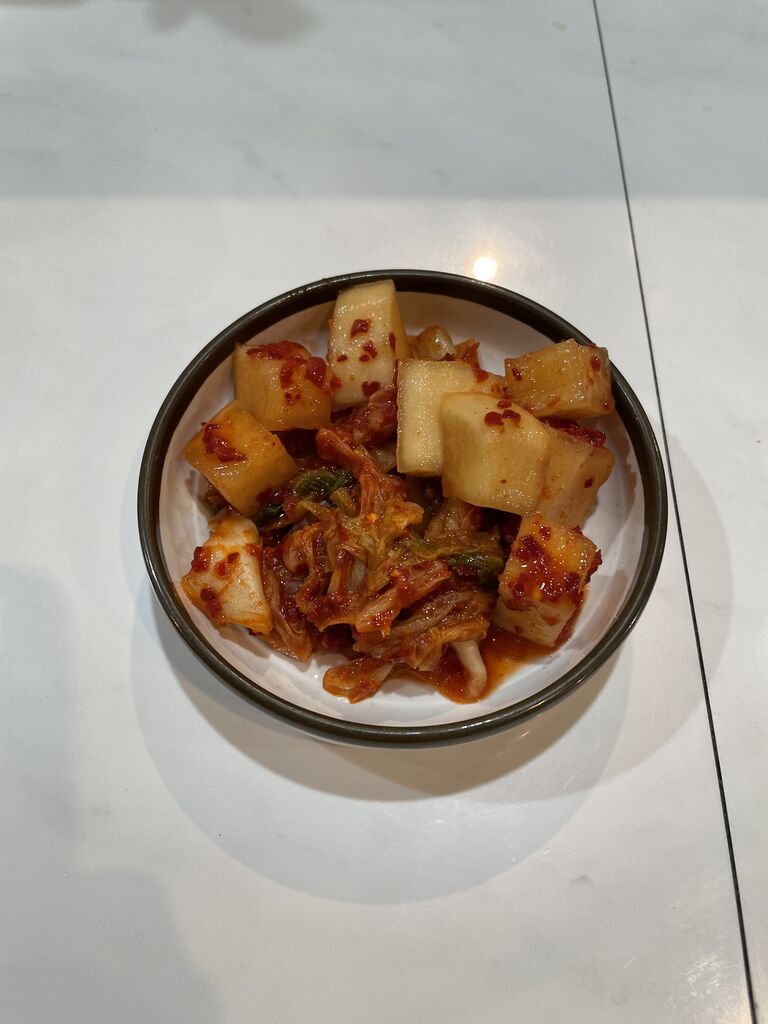 キムチはピリ辛でご飯がすすむ絶妙な味付けです。