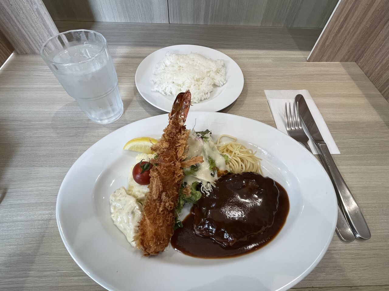 今回オーダーしたのはハンバーグとエビフライの『A定食(1300円)』です。