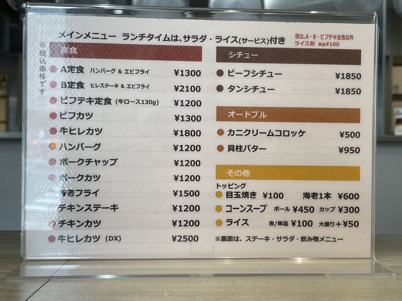 メニューは人気のビフテキやハンバーグを中心に複数の