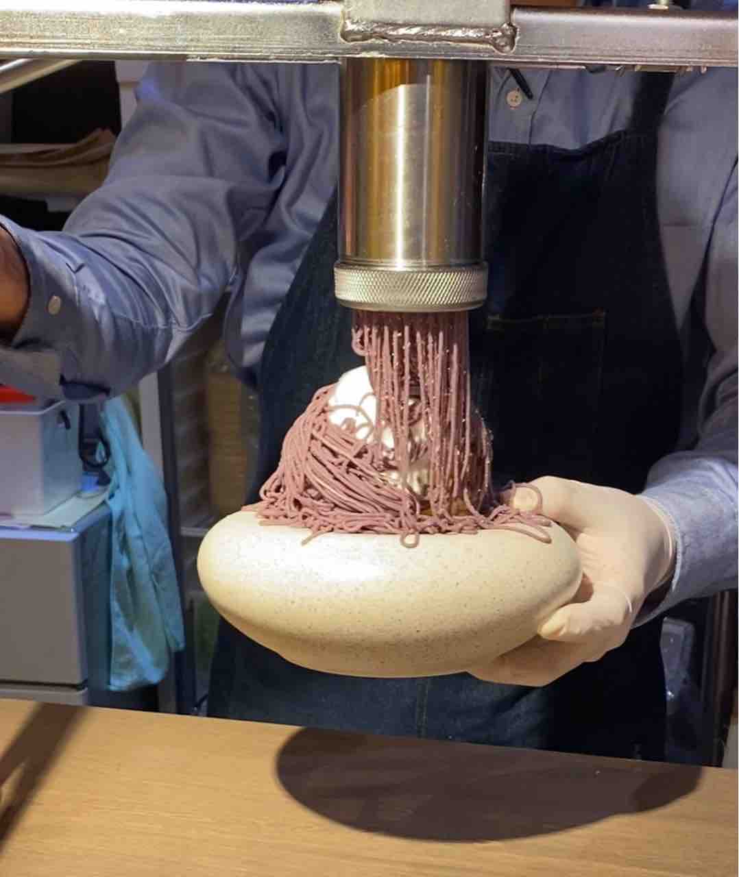言われるがまま、動画を回すと専門の絞り機から紫色のモンブランが出てきました。
