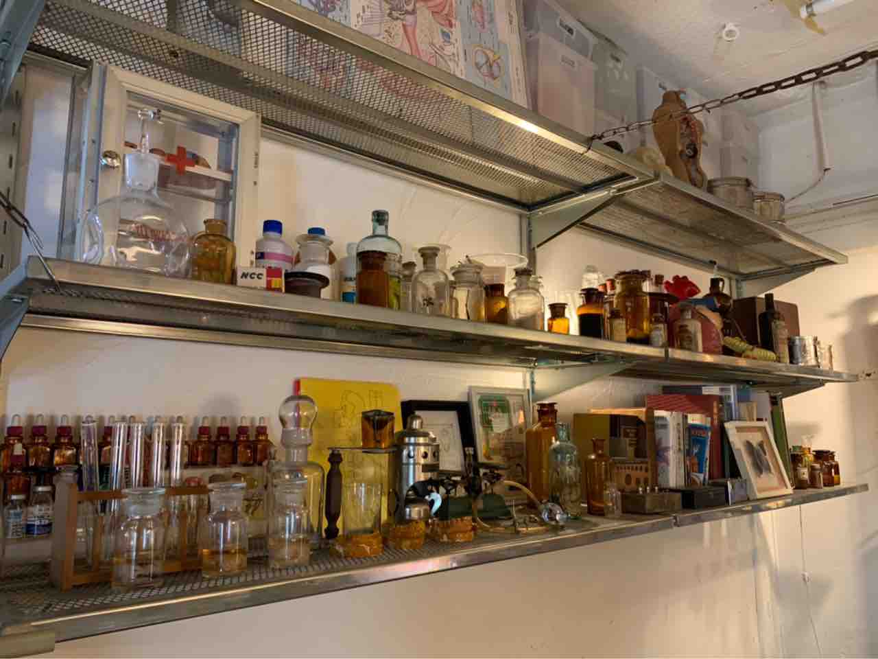 試験管や、注射器、薬品の瓶などなど…病院を彷彿とさせるようなインテリアの数々。