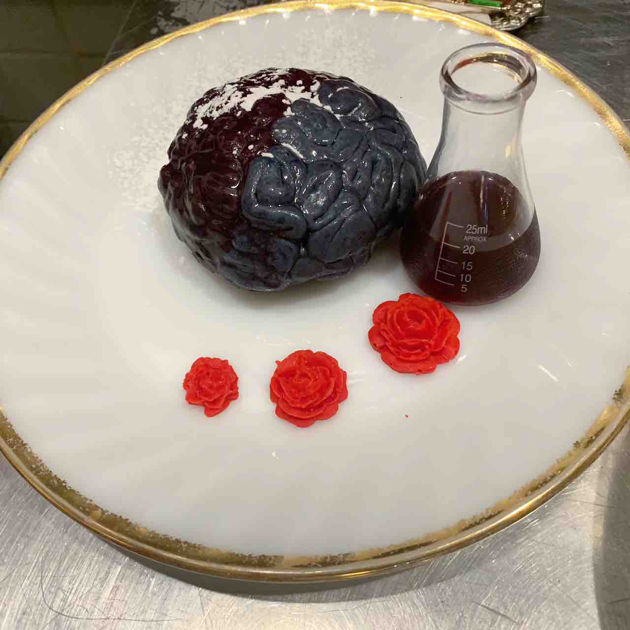 脳みそのケーキにナイフを入れる瞬間はついつい息を呑んでしまいます。