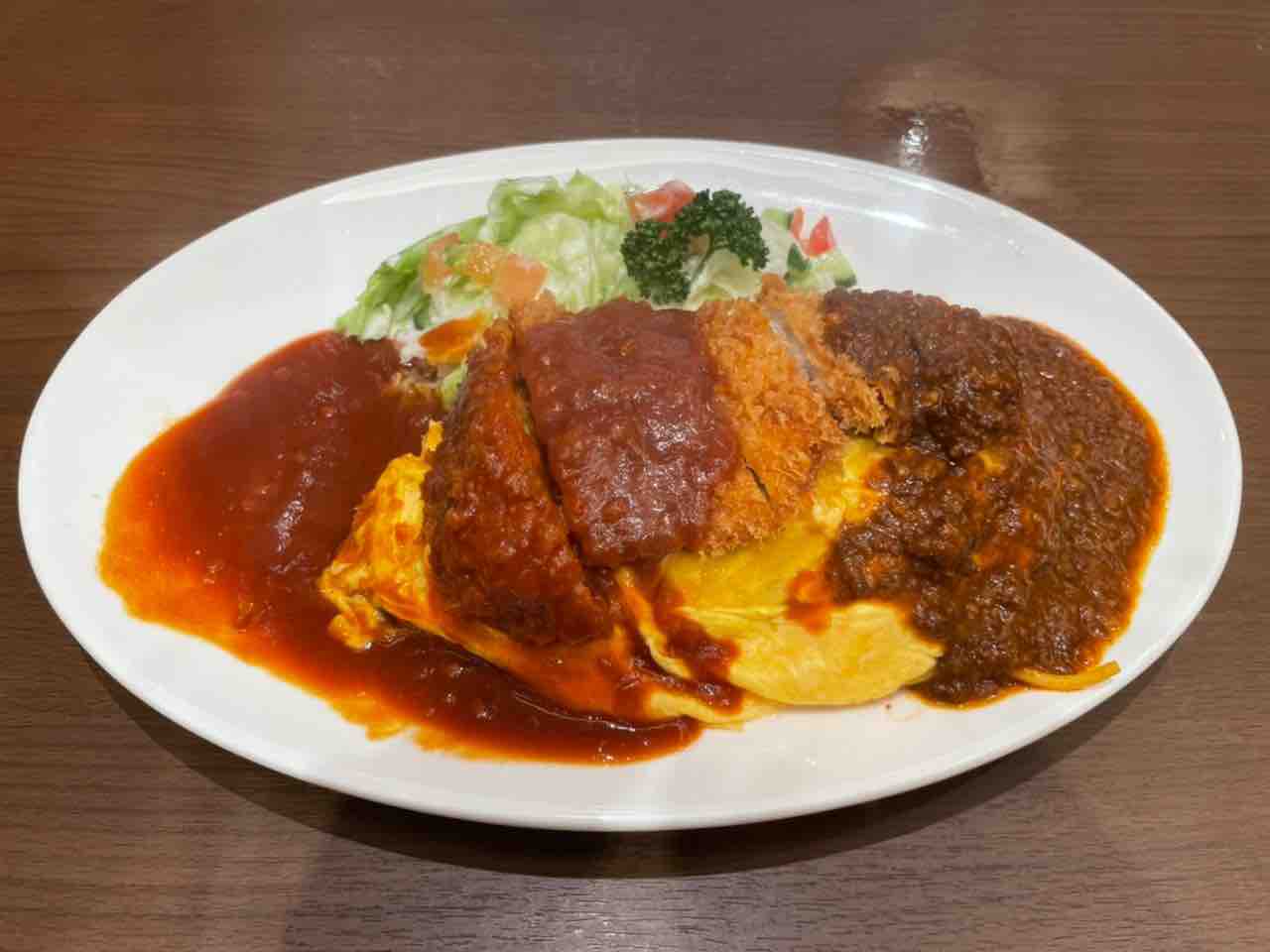 オムライスの上にはカツ、横にはスパゲティー。