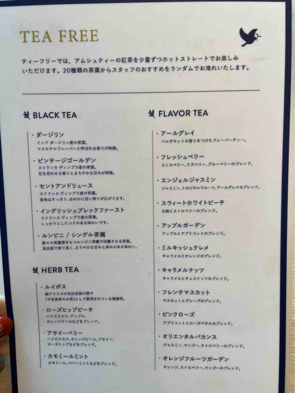 クリームティーのメニューにあるティーフリーというのは下の写真にあるティーフリーのメニューのなかから店員さんがランダムでお茶を淹れてくれます。