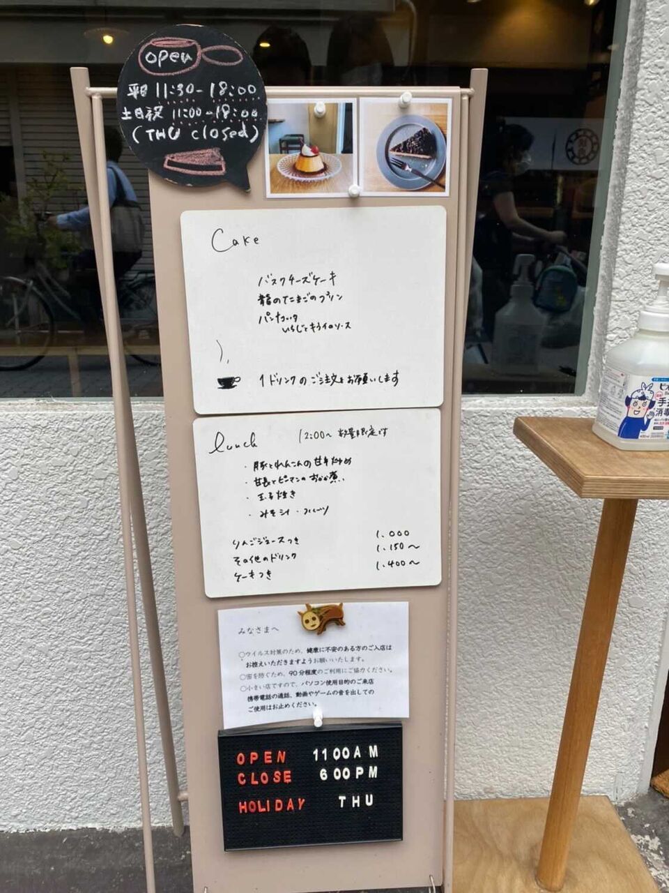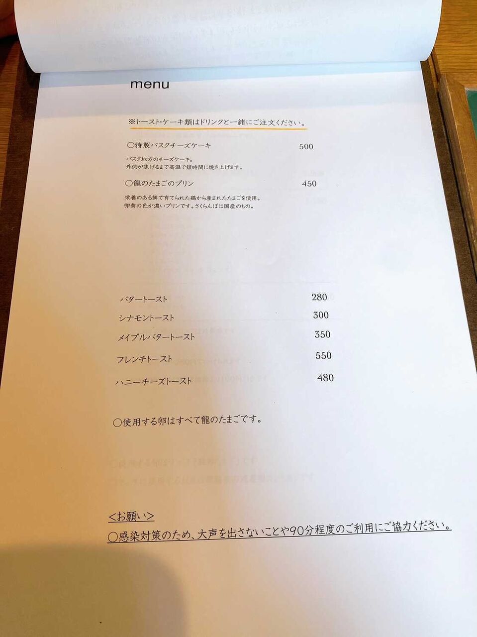また、メニューと消毒液が置かれていました。