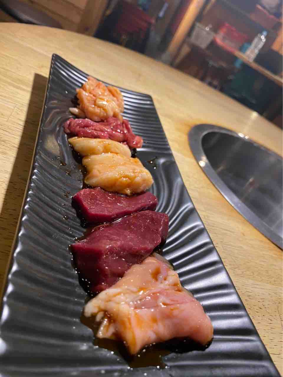 こちらが看板メニューの塩タンです。炭火で焼くこの匂いがまた最高ですよね!ホルモン5種盛り合わせも頂きました。