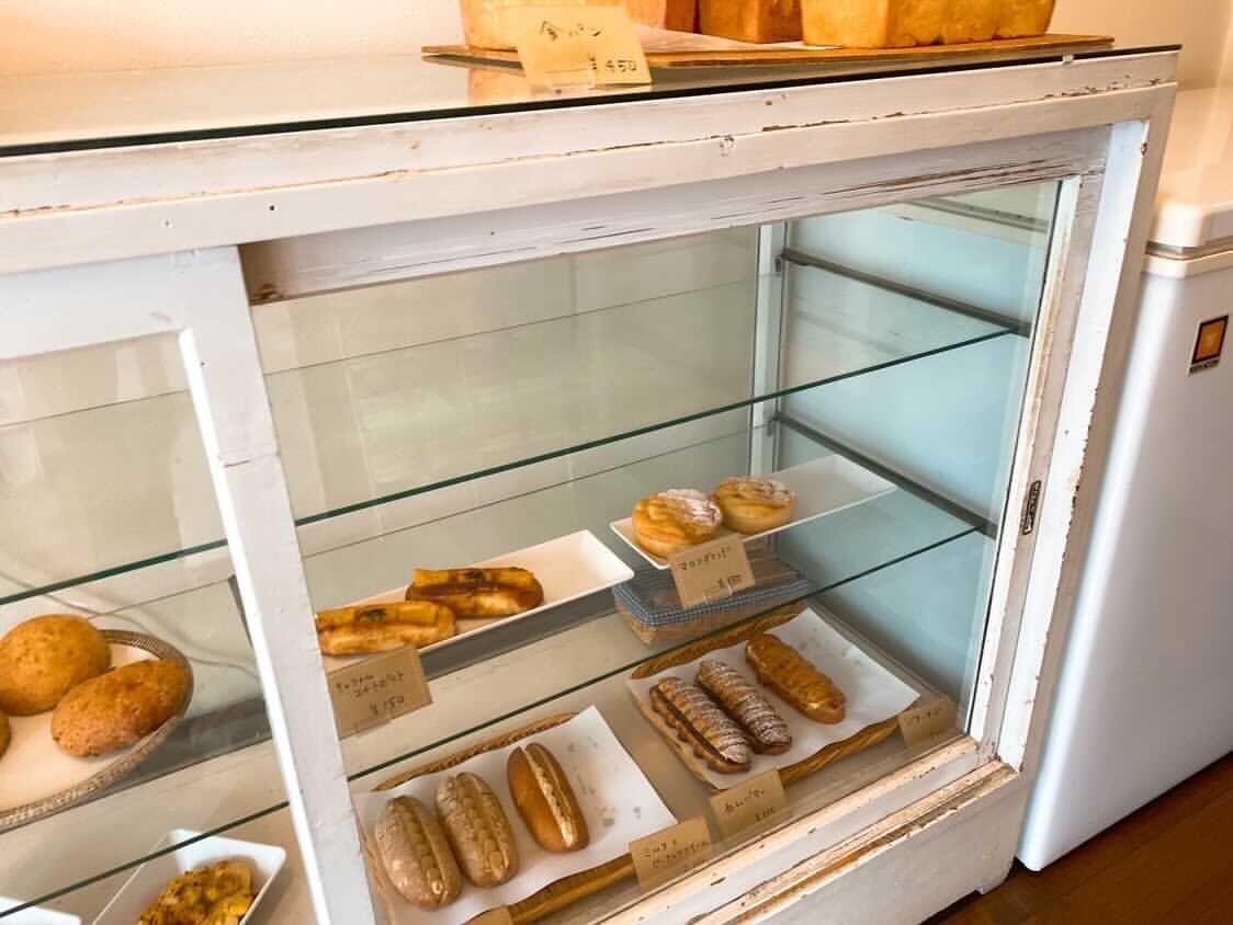 昭和レトロな木製のショーケースにはお店自慢のパンがたくさん並べられていました。