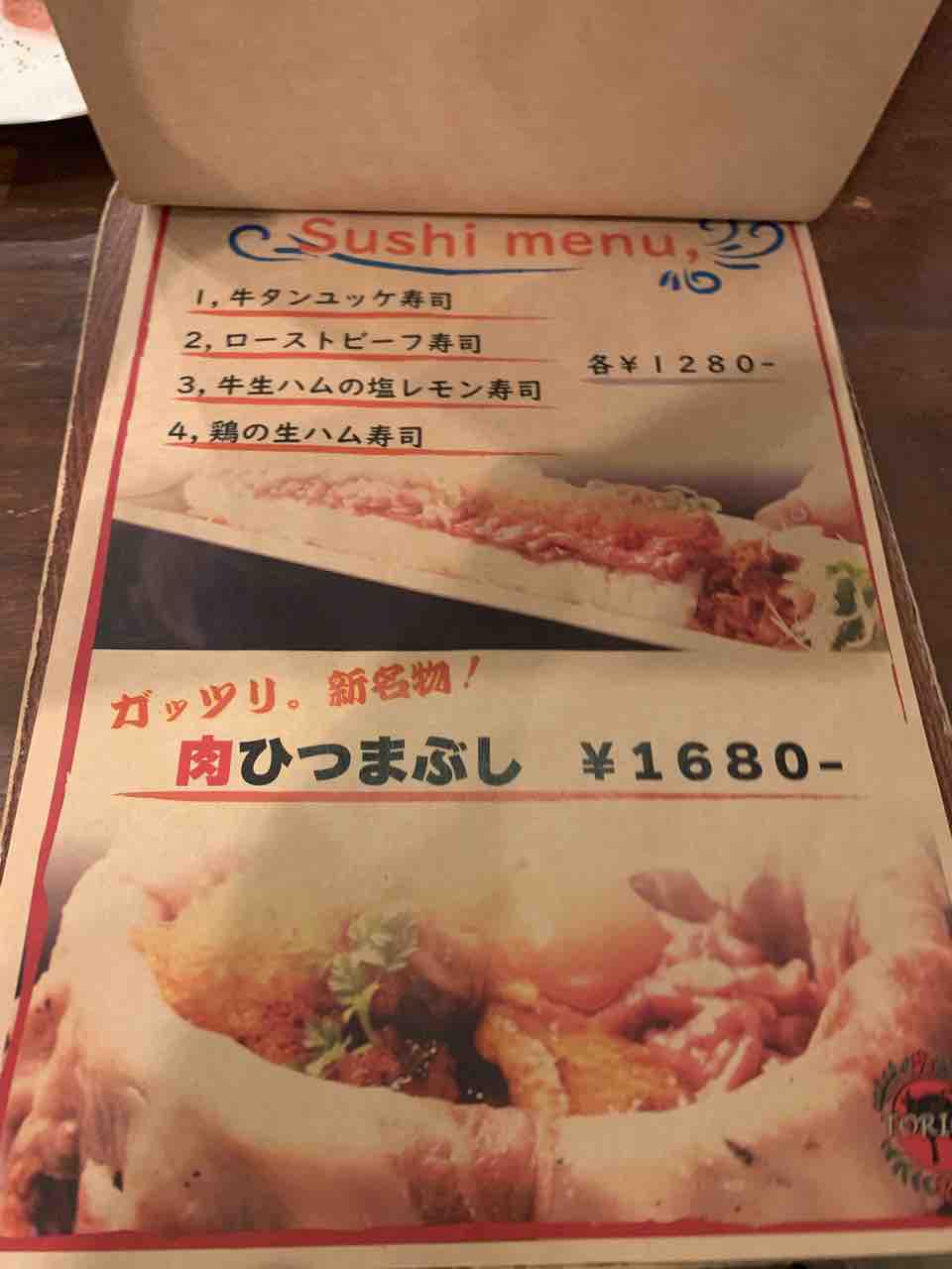 こちらは名物の[肉寿司]や[肉ひつまぶし]のメニューです。