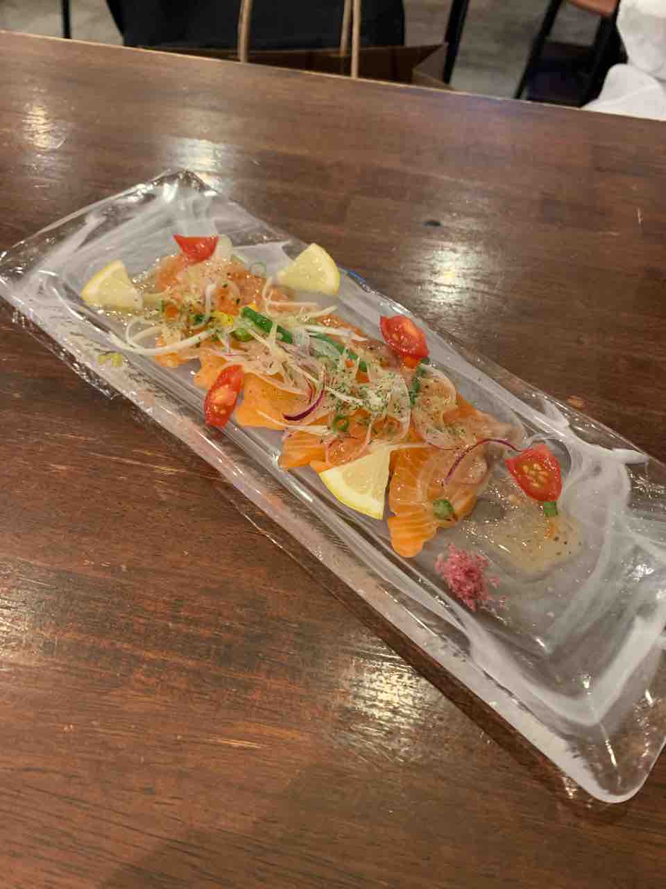 香味野菜を巻いたサーモンにレモンの酸味がマッチ。