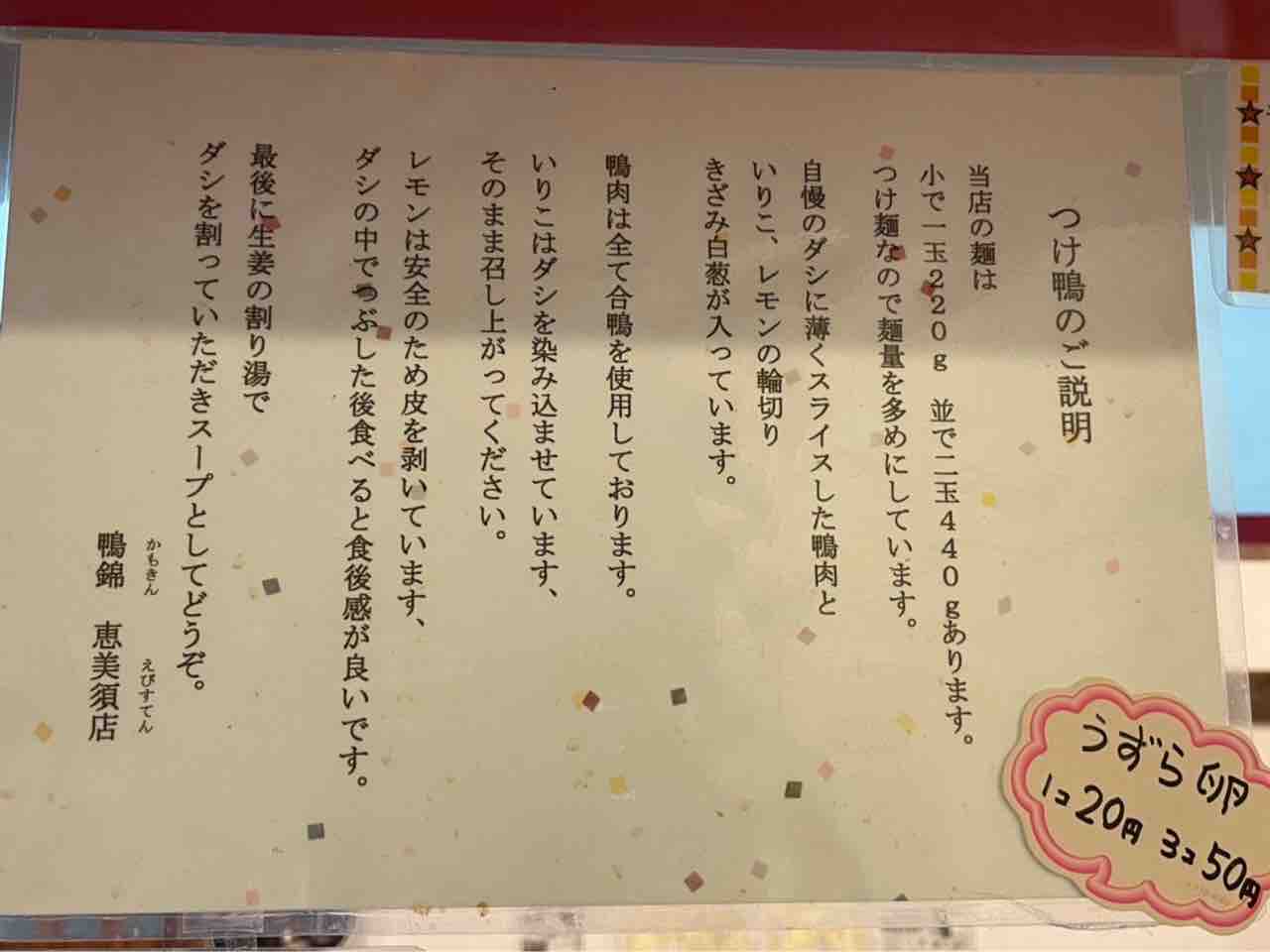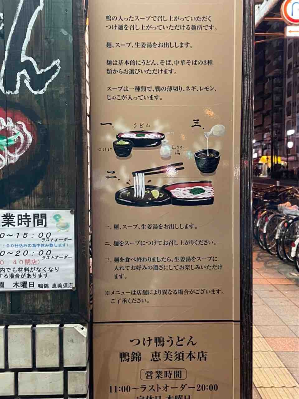 動物園前駅やJR新今宮東口から徒歩5分の場所にある『つけ鴨うどん 鴨錦 恵美須本店』さんに行ってきました。