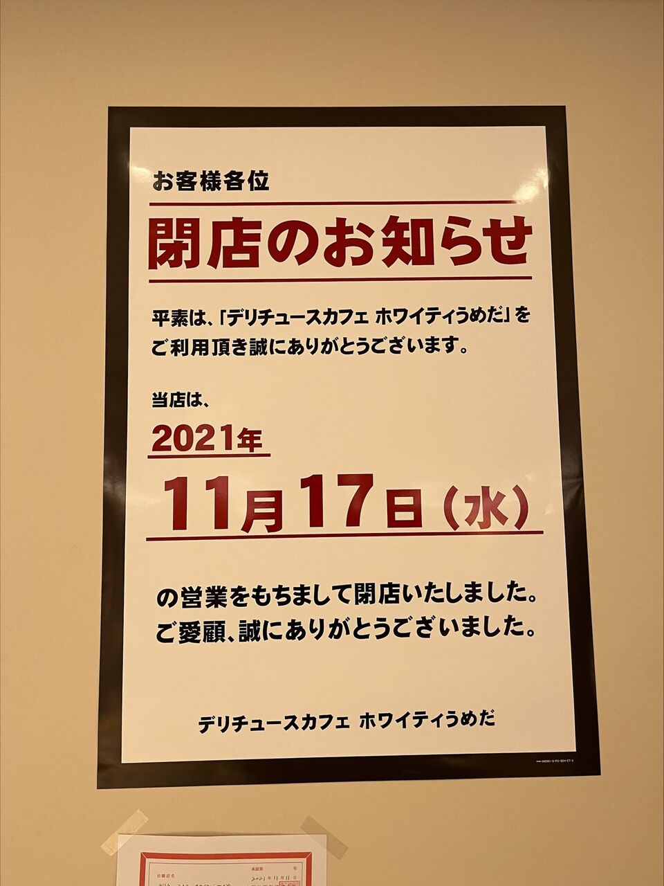 泉の広場にあった「デリチュースカフェ ホワイティうめだ店」さんが閉店していました。