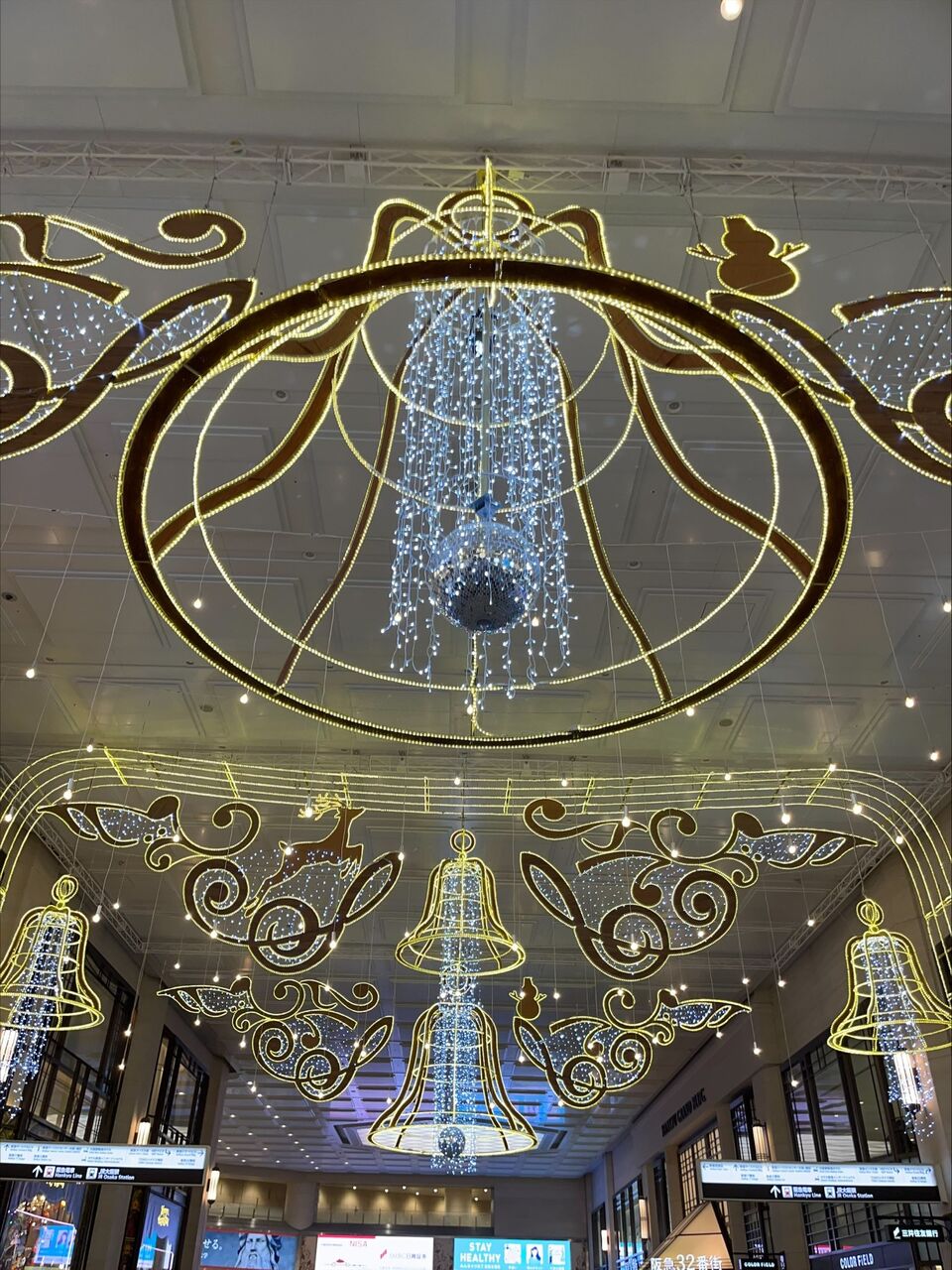 2021年11月23日 阪急百貨店と阪急32番街の目の前に巨大な鐘のイルミネーションが! ・阪急百貨店と阪急32番街の通りがクリスマスっぽいイルミネーションに!毎年11月頃から色んな場所でライトアップされますね。今回は梅田の阪急百貨店と阪急32番街の通りで大きな鐘のイルミネーションが!阪急電車をご利用の方、大阪地下鉄をご利用の方は目にした事のある人が多いはず。こういうイルミネーションを見ると、冬がきたなぁとしみじみと思います。さらに近くに行ってパシャリ。真下で撮影するとインパクトは大!阪急の近くをよく通る方は是非立ち寄ってみてはいかがでしょうか。 ■阪急32番街■住所〒530-0017 大阪府大阪市北区角田町8-47 < 前の記事次の記事 > コメント コメントフォーム 名前 コメント 記事の評価 リセット リセット 顔 星 情報を記憶 コメントを投稿する