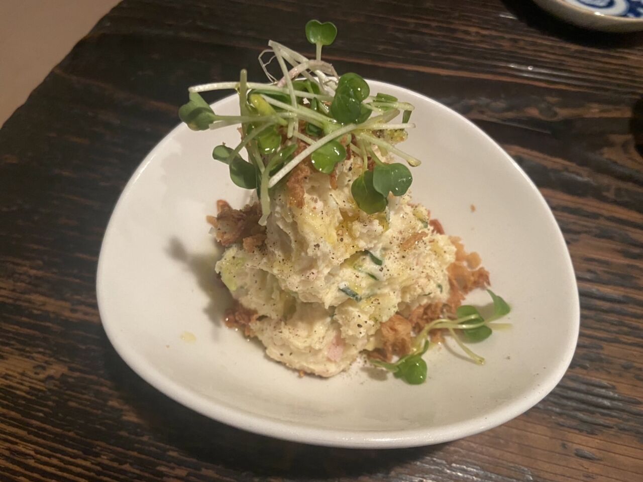 小さなタワー状に盛り付けられたポテトサラダは、上に乗ったかいわれの絶妙な苦みとポテトの甘さがマッチしています。