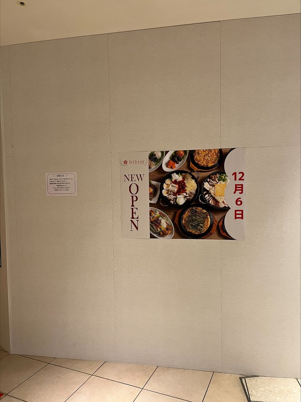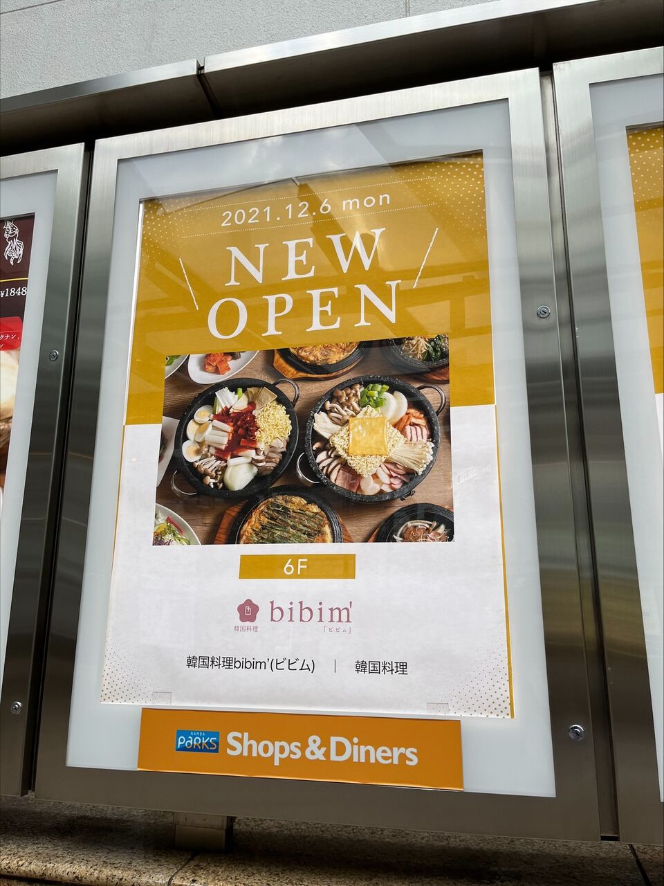 早速開店予定のなんばパークス6Fまで向かってみると、看板にはシールで貼られた開店予定の「韓国料理bibim'(ビビム)」さんが。