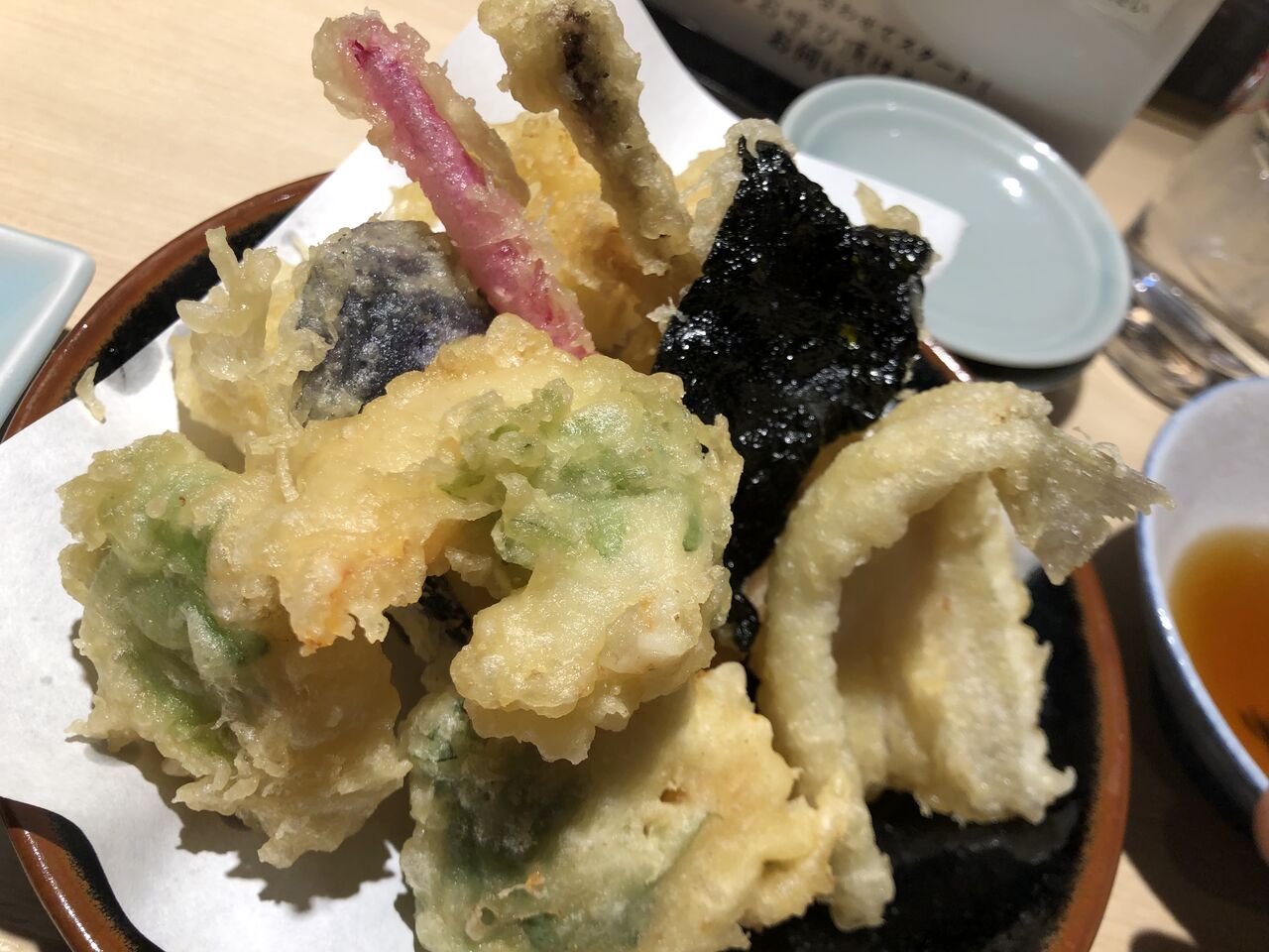 内容はえびの大葉巻き、いかのゲソ、キス、チューリップ、なす、しょうが、のりの天ぷらでした。