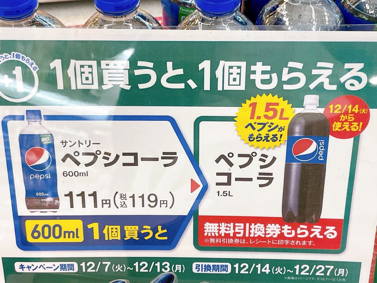 今回のキャンペーンの内容は12/7(火)〜12/13(月)までの間に「サントリー ペプシコーラ 600mlを買うとサントリー ペプシコーラ 1.5Lの無料引換券もらえる!」というもの。