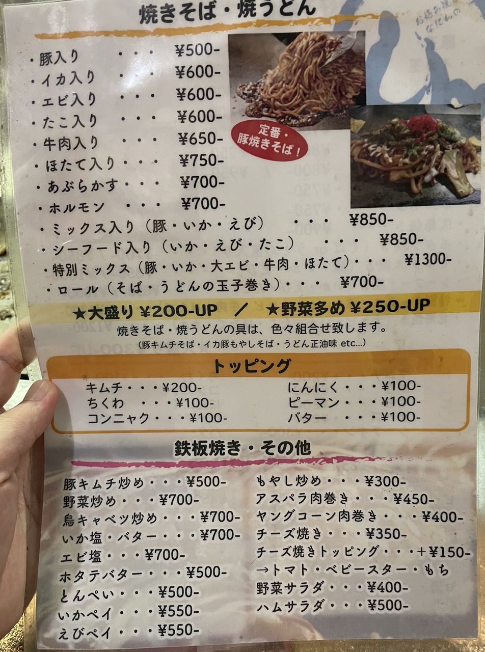メニューは焼きそばとお好み焼きをはじめとした鉄板焼きが勢揃いしています。