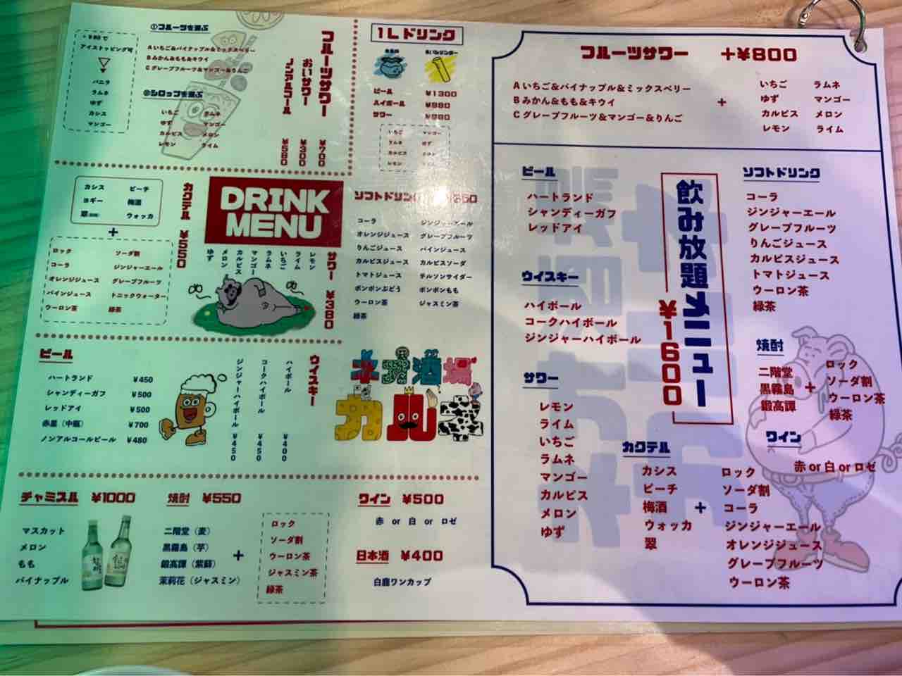 ドリンクのメニューは、定番のアルコールドリンクに、自分でフルーツとシロップを選ぶことができるフルーツサワーに、シリンダーや金魚鉢で飲める1リットルドリンクと、遊び心あるメニューもおいてあります。