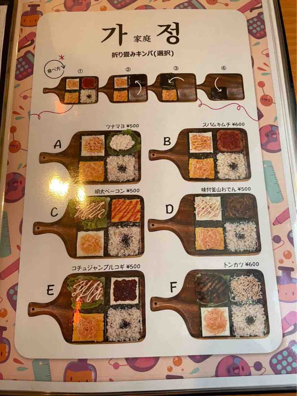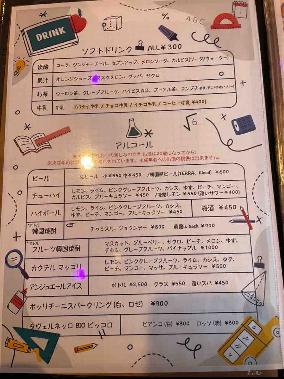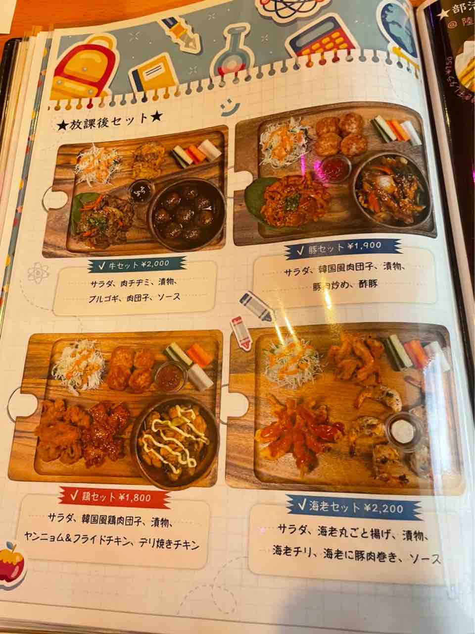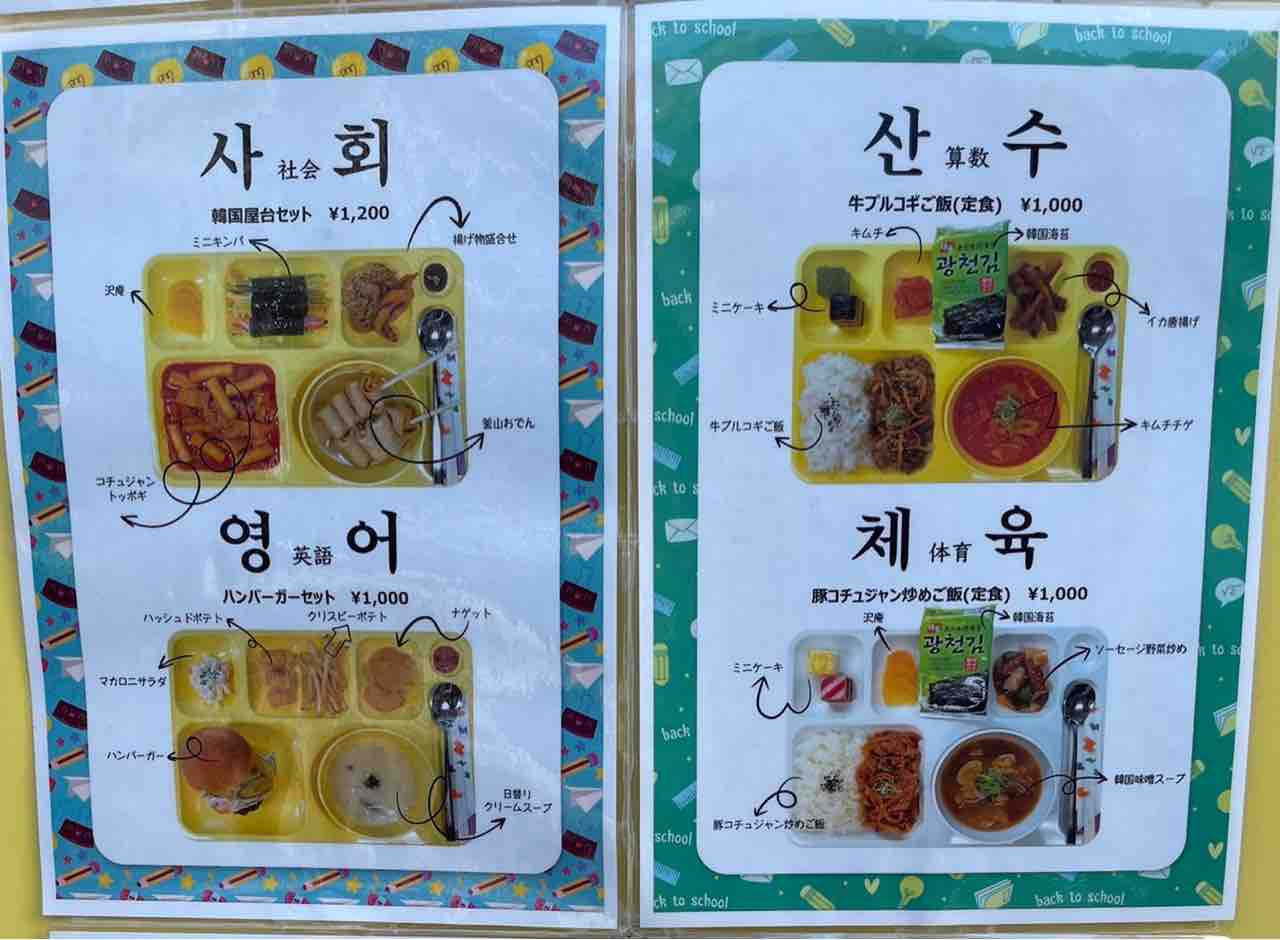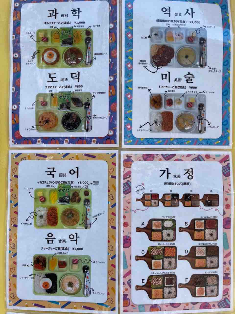 黒板の真ん中にはK-popのmvが流されており、店内はまるで韓国の学校で給食をいただいているかのような気分を味わえます。メニューはこちら