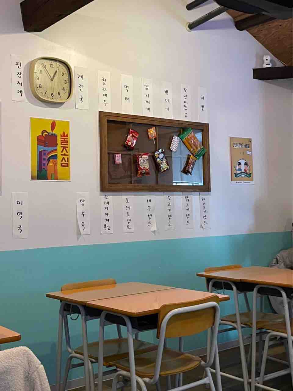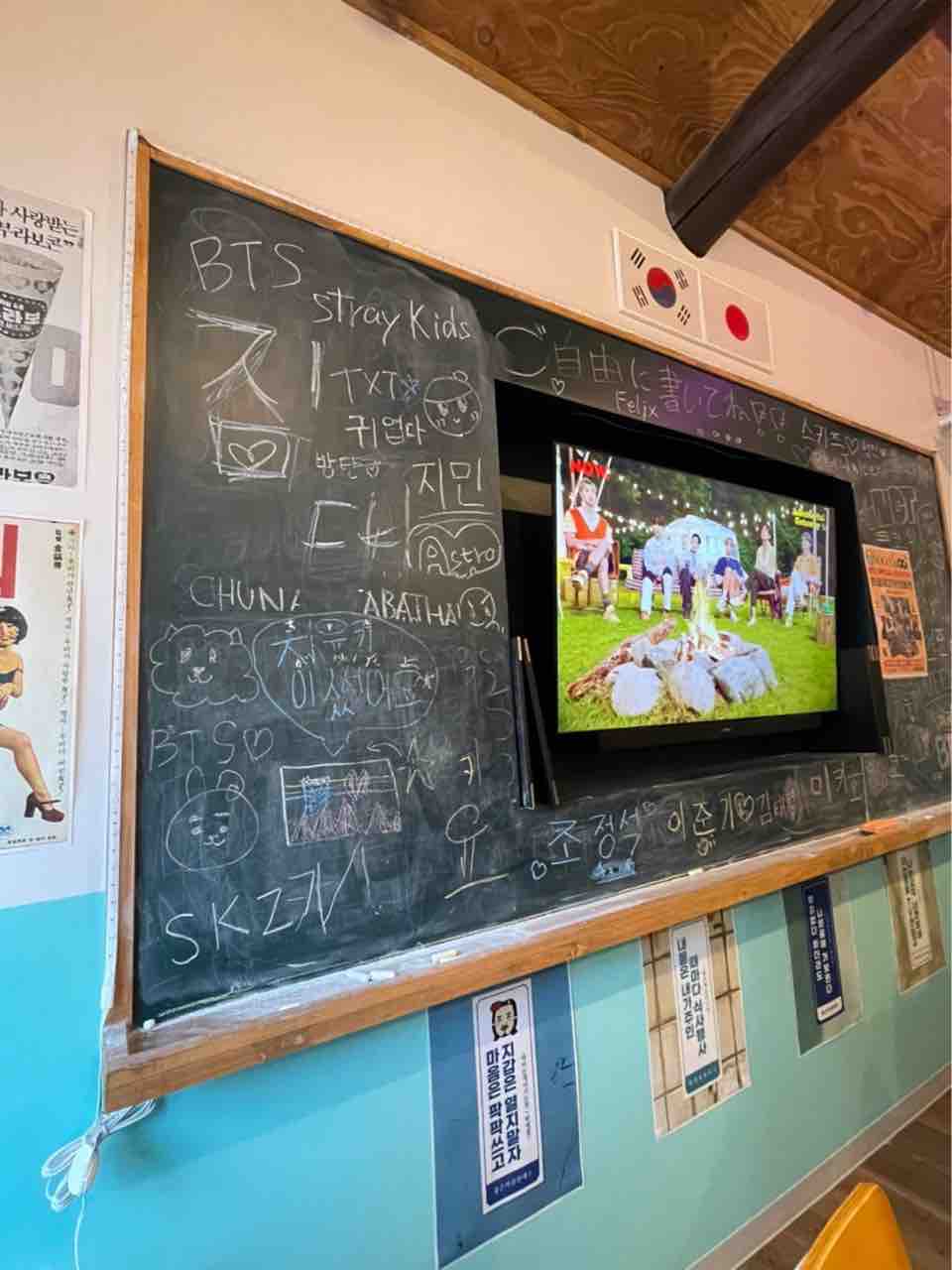 黒板の真ん中にはK-popのmvが流されており、店内はまるで韓国の学校で給食をいただいているかのような気分を味わえます。