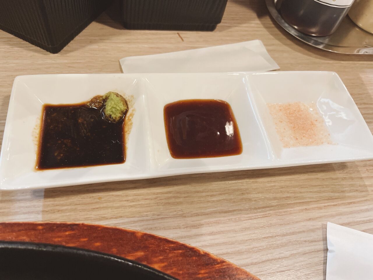 こちらが左からワサビ醤油・タレ・岩塩で用意いたしましたがほぼワサビ醤油しか使わなかったです。