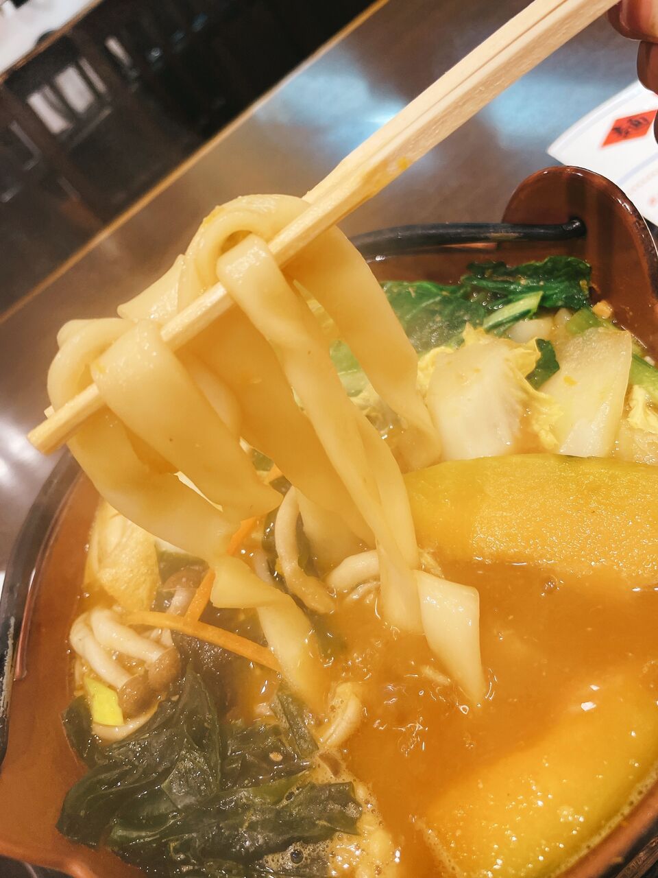 見た目の通り、平打ち麺でかなり太いです。