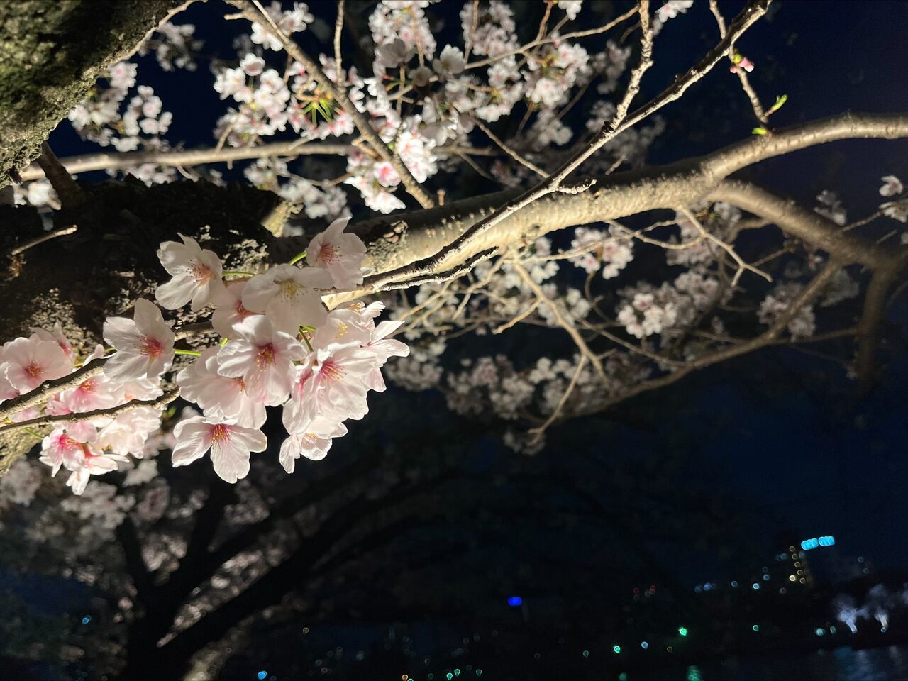 夜になると桜の木の下にあるライトが照らされて夜桜が綺麗に見る事が出来ます。