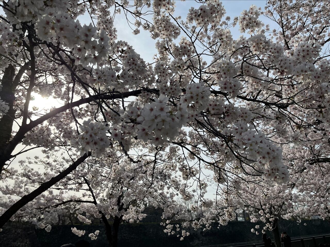 大阪城のお堀の近くでも桜が綺麗に咲いていて、こちらは散歩しながら花見を楽しんでる方が多く見受けられました。