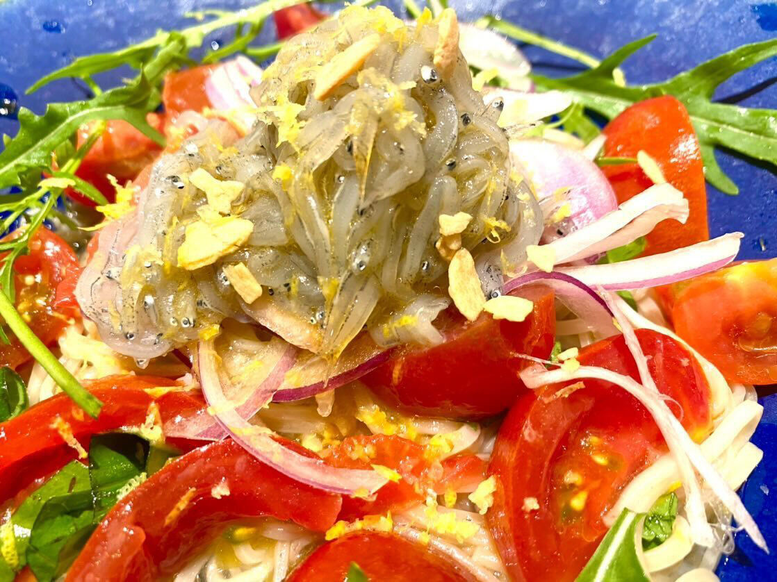 シラスとトマトがたくさん乗っていて、島レモンとポン酢がベースの味付け。
