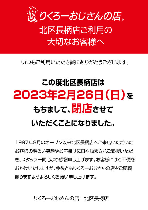 1997年8月にオープンしてから20年以上も愛されてきた『りくろーおじさんの店 北区長柄店』が2023年2月26日(日)をもって閉店することがわかりました。