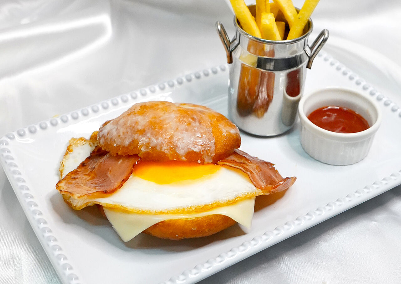 目玉焼き、キャラメリゼしたベーコン、スライスチーズを挟んだ『ドーナツメルトメープルベーコンエッグ』。