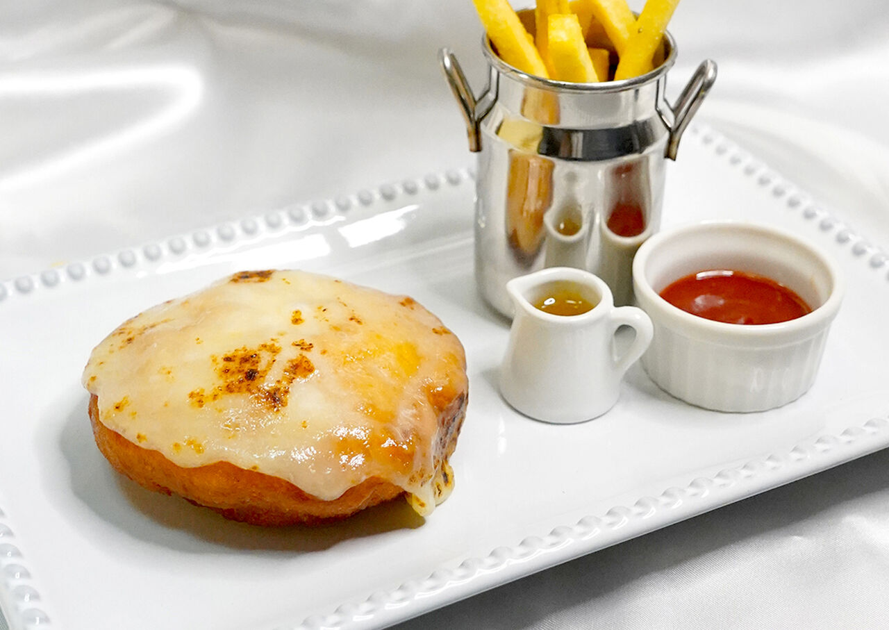 ミックスチーズ、ゴルゴンゾーラチーズ、モッツァレラチーズ、ブリーチーズを乗せてブリュレしたドーナツに、別添えのはちみつをかけて味変も楽しめる『クアトロブリュレチーズ』。