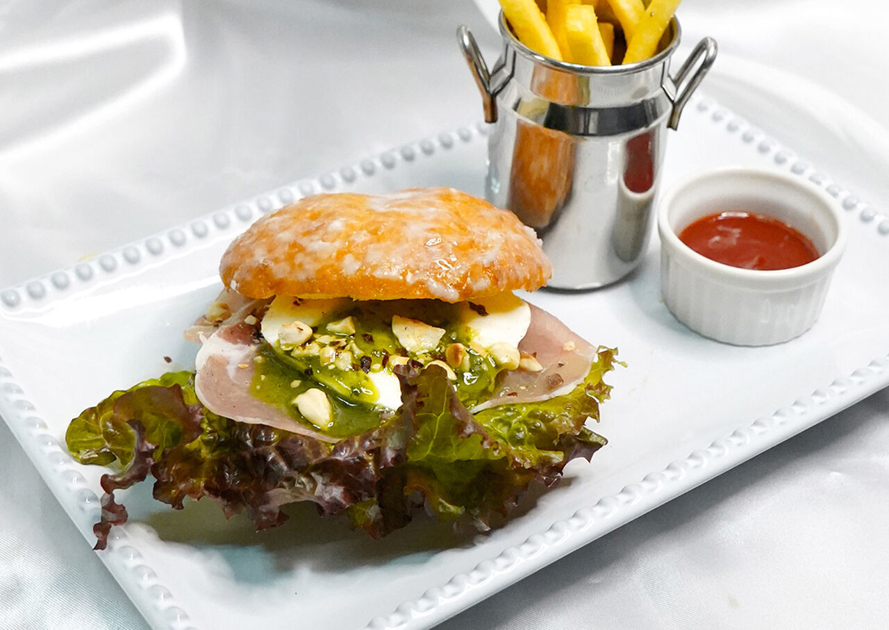 レタス、モッツァレラチーズ、生ハム、スライスチーズにバジルソースとミックスナッツをトッピングし、ドーナツで挟んだ新感覚『ルーサーバーガー生ハムモッツアレラ』。