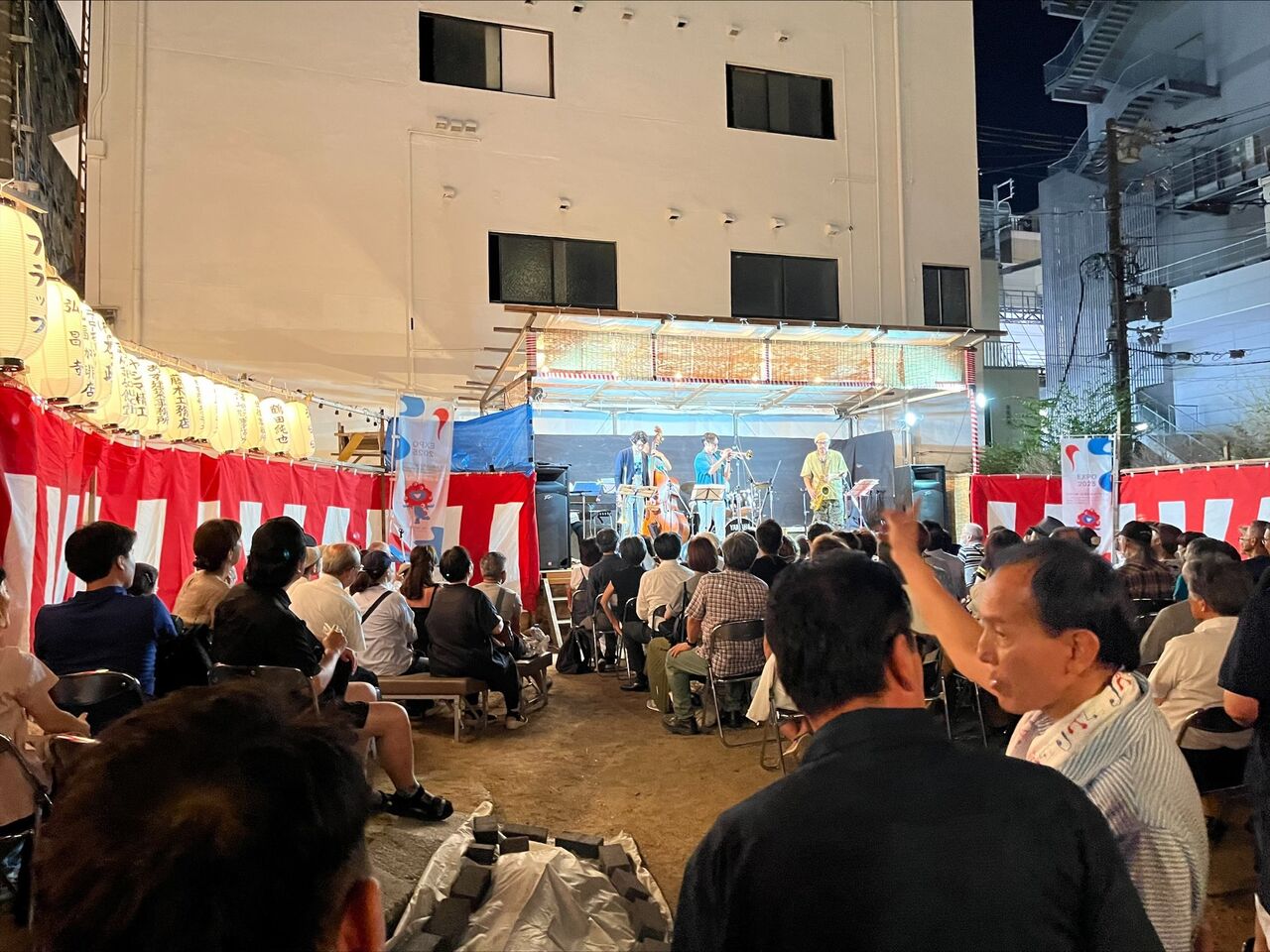 見どころポイントのジャズコンサートは法善寺横丁内にある広場で行われていました。
