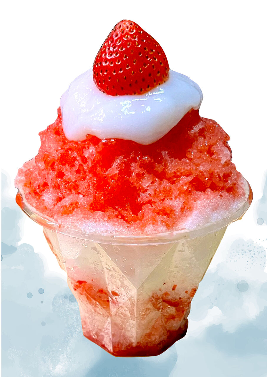天然水かき氷に甘酸っぱいいちごソースとふわふわのやわもちをかけ、フレッシュないちごをトッピング!