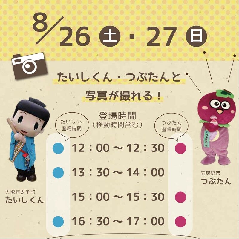 太子町のご当地キャラクター「たいしくん」と羽曳野市のご当地キャラクター「つぶたん」の登場時間は上記を参考に!