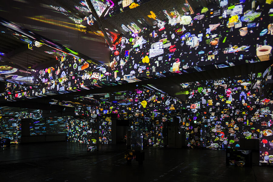公募で募集されたたくさんの写真から様々なオブジェクトが暗闇の中をゆっくり動いたり早く動いたりと浮遊する映像空間。