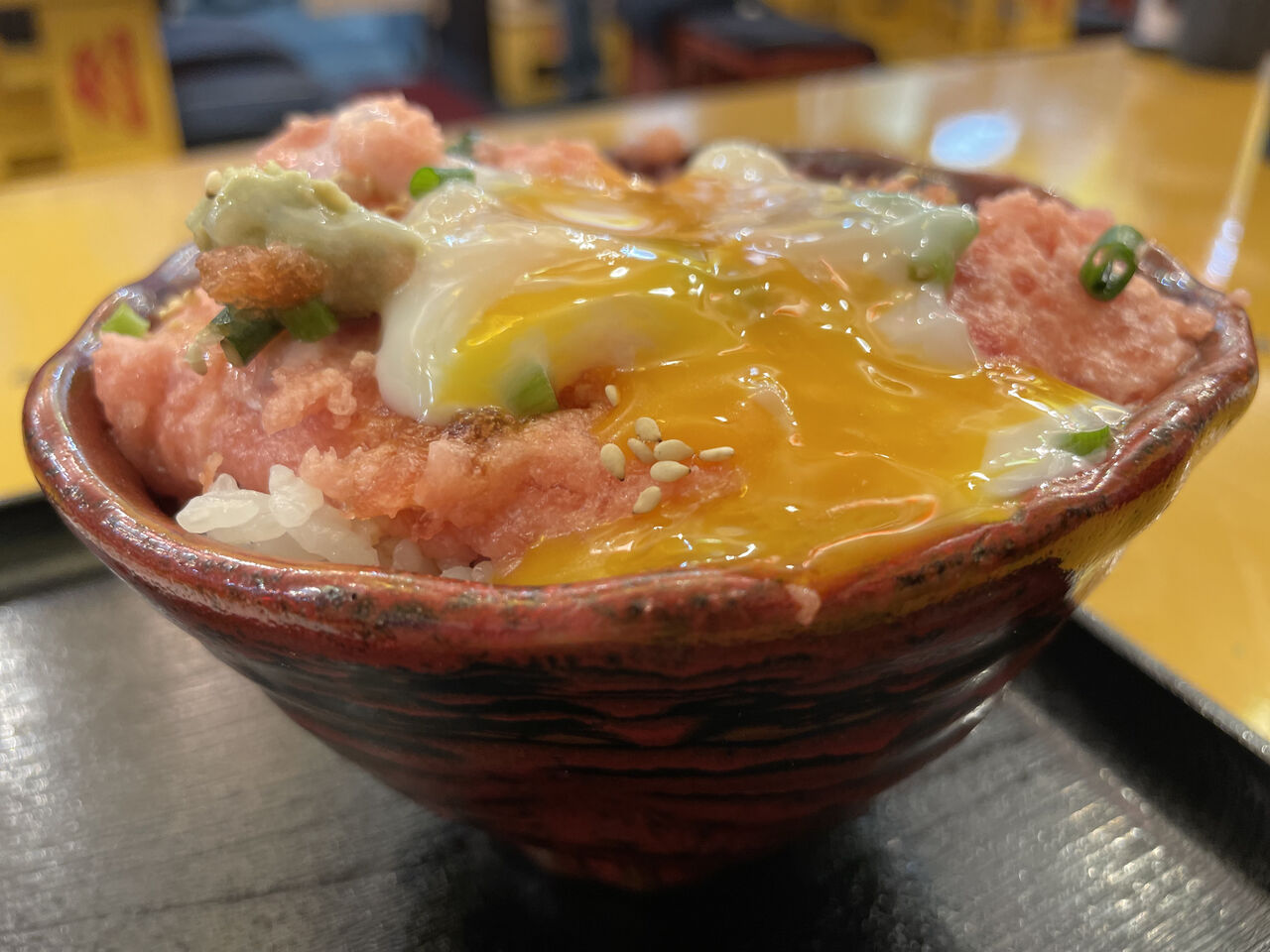 圧倒的なテカリ具合を見せるネギトロの中央に乗っかった温玉がインパクト大。