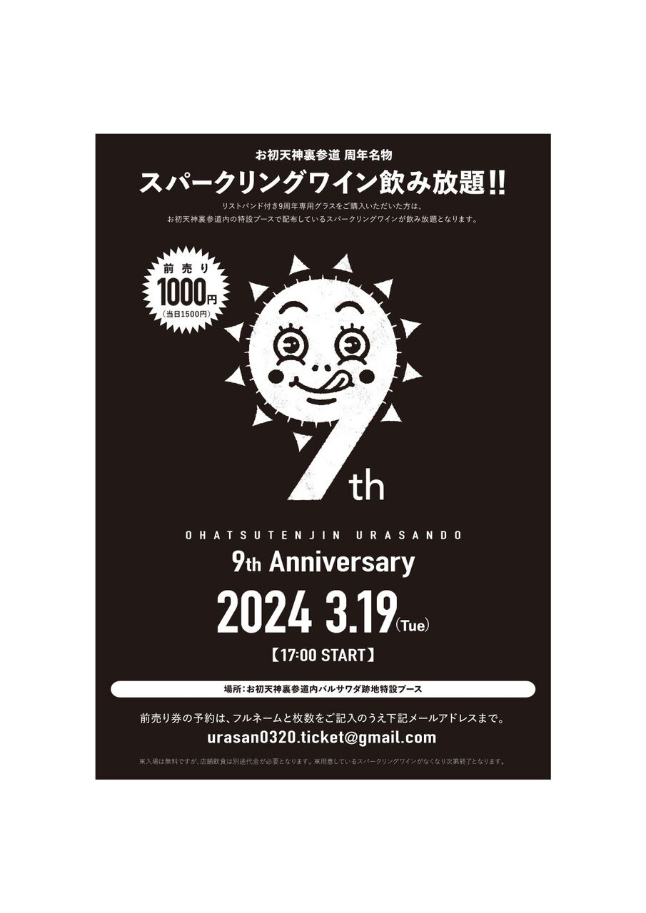 「9周年専用グラス」を購入(前売りだと1000円、当日売りだと1500円)すると当日お初天神裏参道内の特設ブースで配布しているスパークリングワインが飲み放題になる!