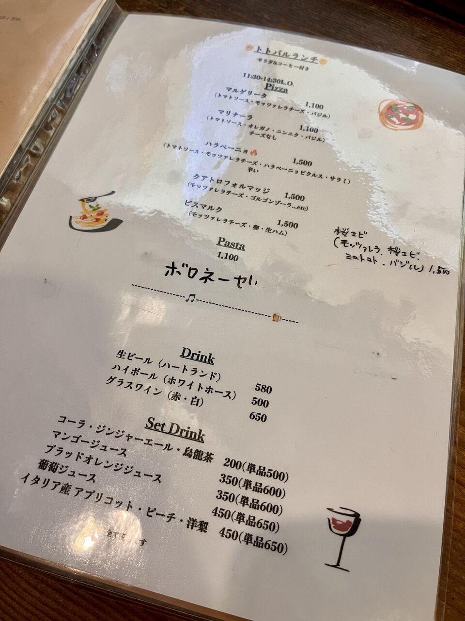 ランチはパスタが日替わりで、ピザは定番メニュー。