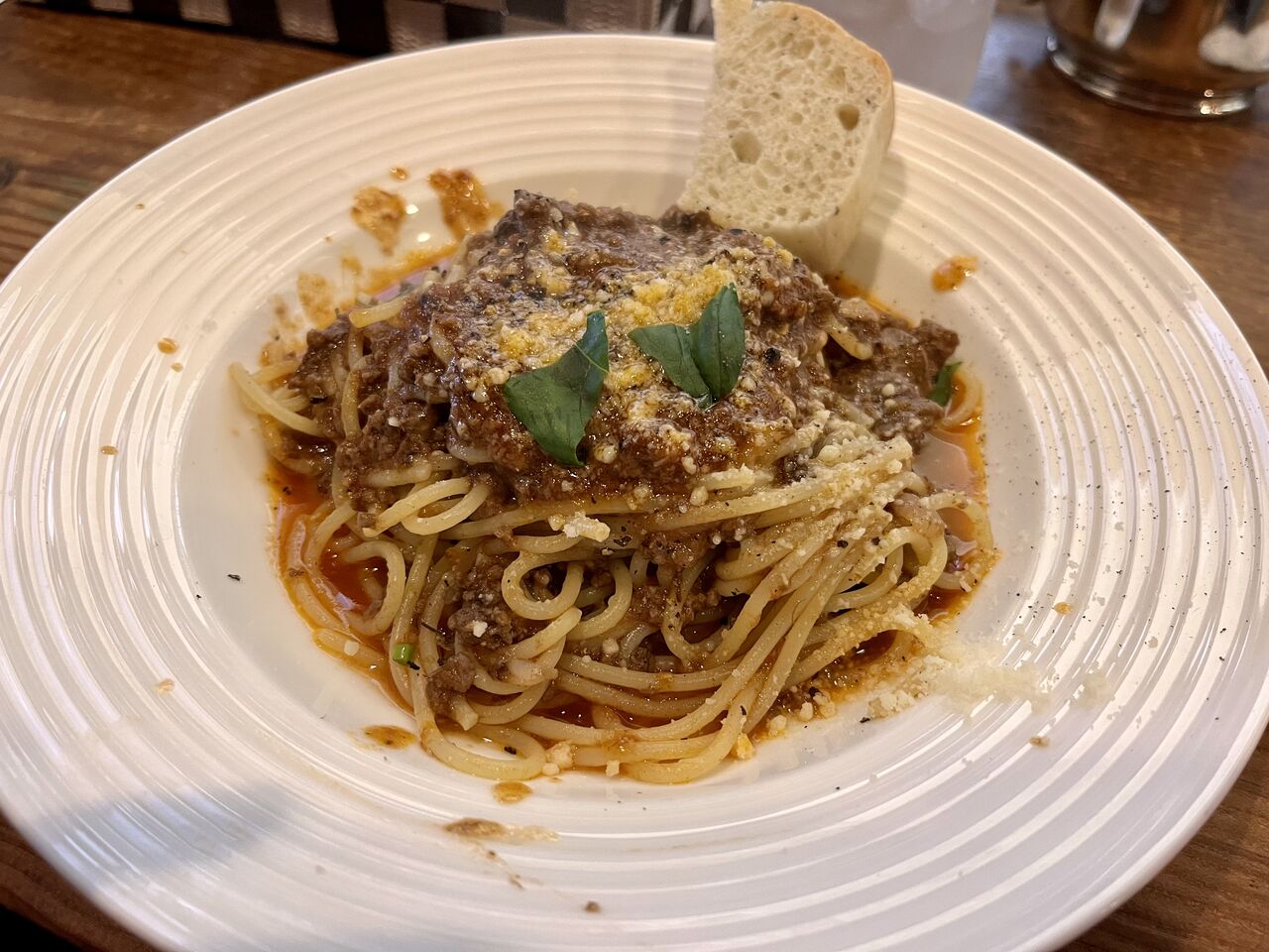 お肉たっぷりのボロネーゼはパンもついてかなりのボリューミー。