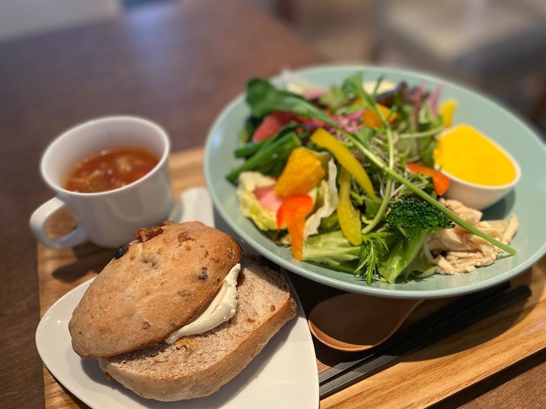 今回注文したのは彩りの野菜サラダと焼きたてのベーグル。