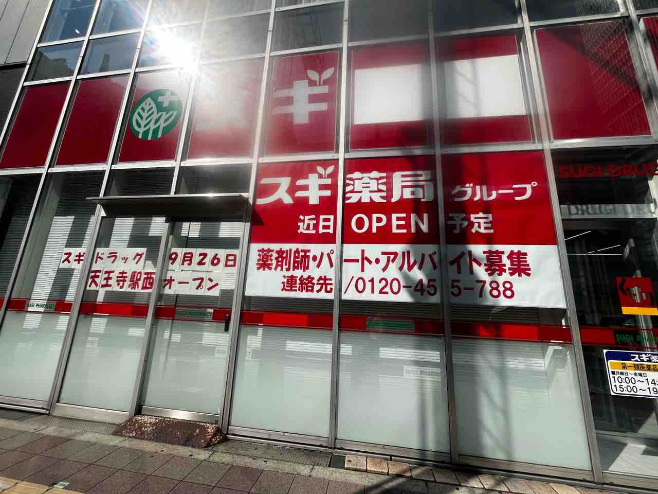 天王寺駅のスギ薬局といえば、北口側、天王寺公園の向かい辺りに集中していましたが、駅の西側にも開店するようです。近鉄線や大阪メトロ 御堂筋線ユーザーの方にとっては少しでも近い位置に店舗ができるので、来店しやすくなりますね。