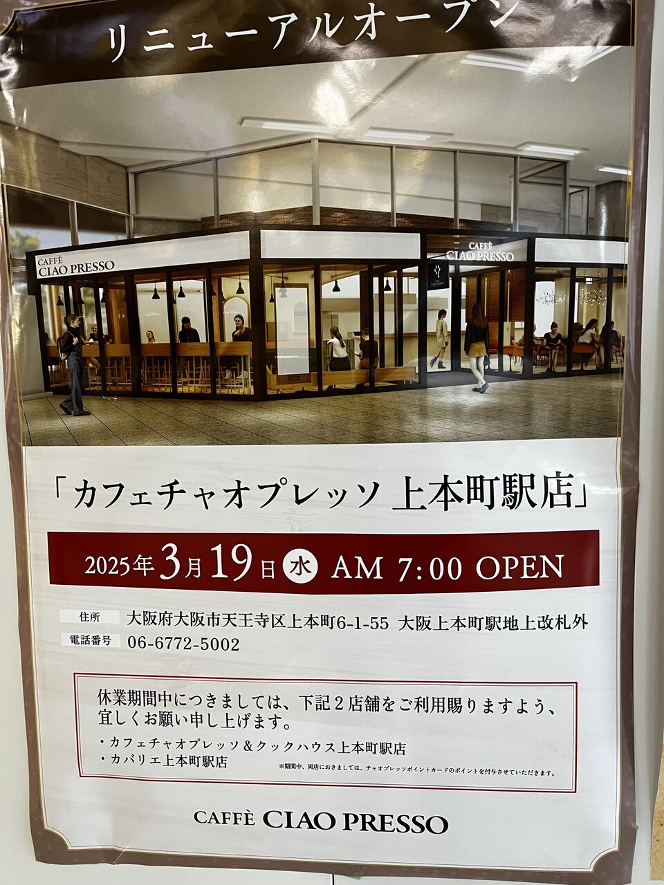 近鉄 大阪上本町駅の改札外にあるカフェ「チャオプレッソ上本町駅店」が3月19日にリニューアルオープンするようです。