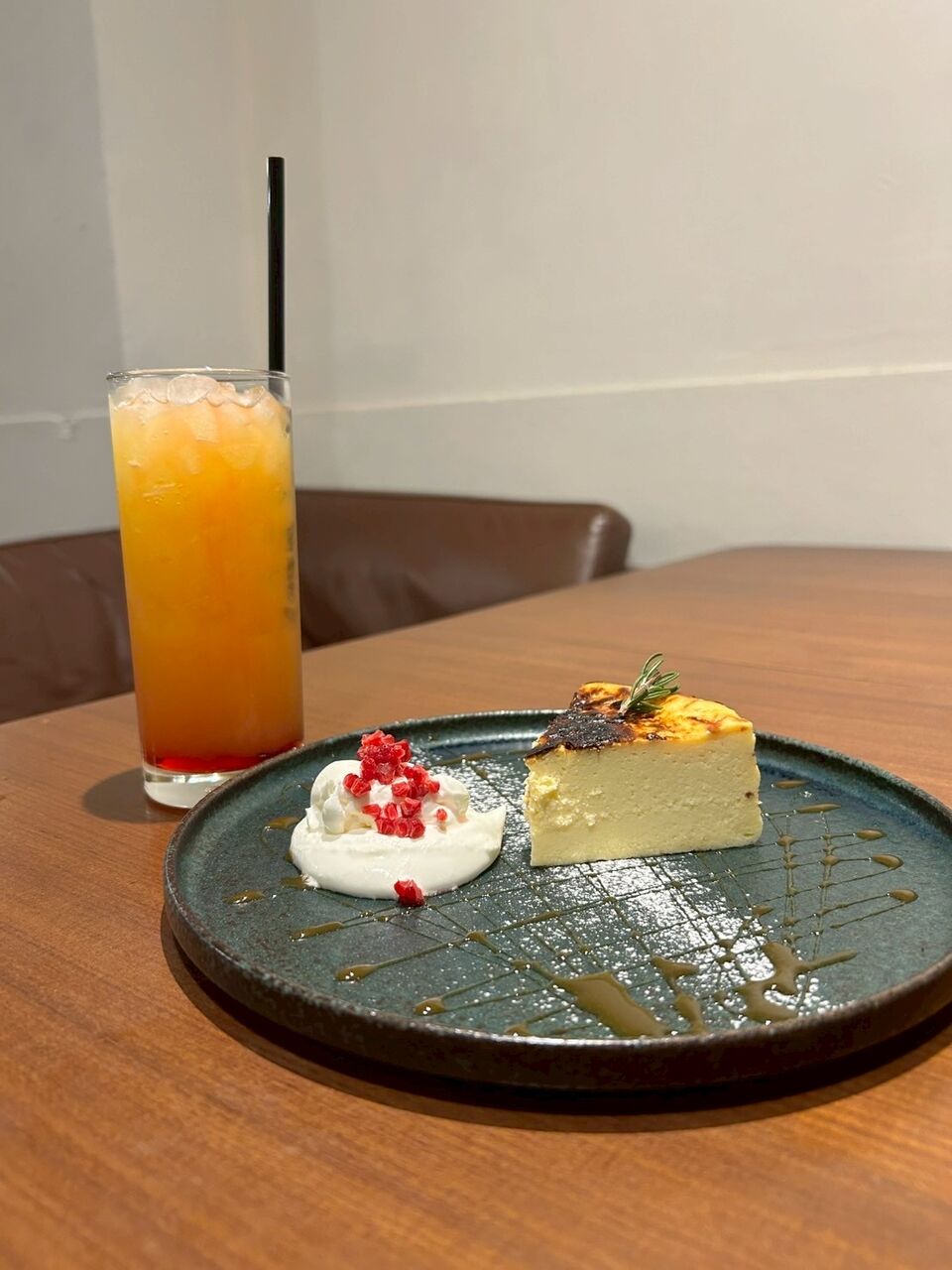 今回は前々から気になっていた「手作りバスクチーズケーキ」とパイナップルジュースを注文。