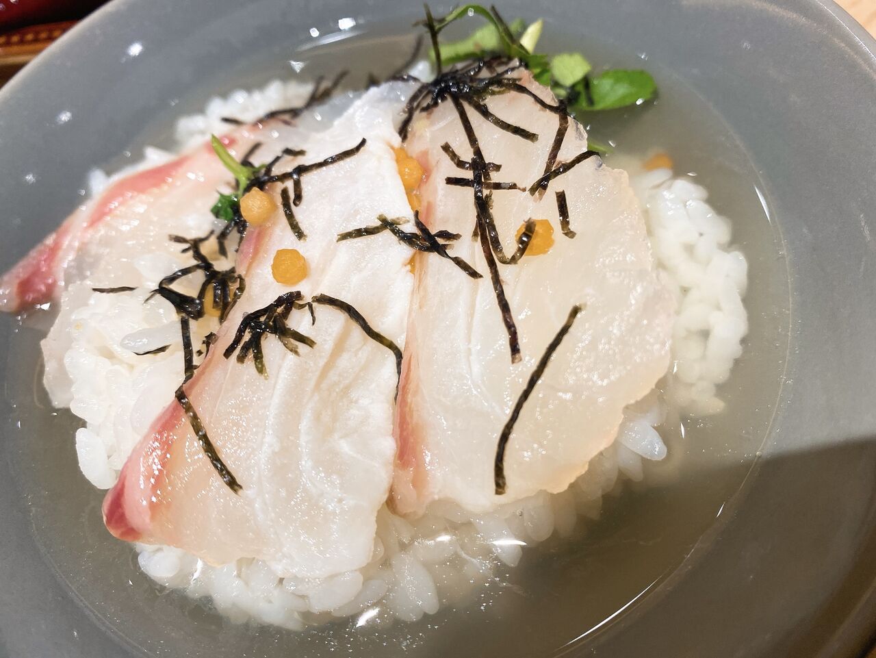 鯛茶漬けの鯛は3切れ入っているのですが、一緒についてるごまダレで一つをそのまま、残りの2切をご飯の上に乗せて出汁を入れると...鯛茶漬けの出来上がり。